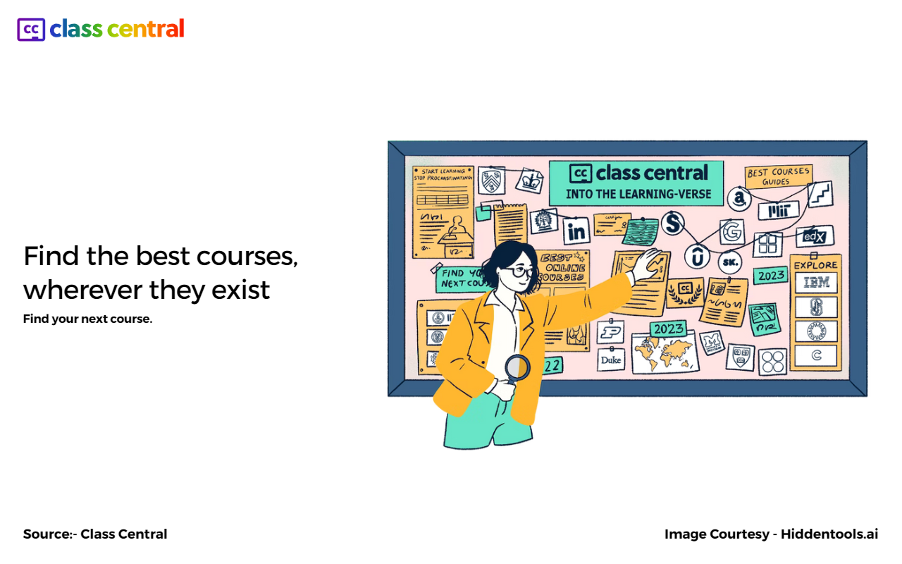 Class Central is an online platform that aggregates and curates courses from various universities and institutions worldwide. It provides a centralized hub where learners can discover, enroll in, and engage with a vast array of courses covering diverse subjects, including technology, business, arts, and more. The platform offers both free and paid courses, allowing individuals to access high-quality education at their own pace and convenience.
